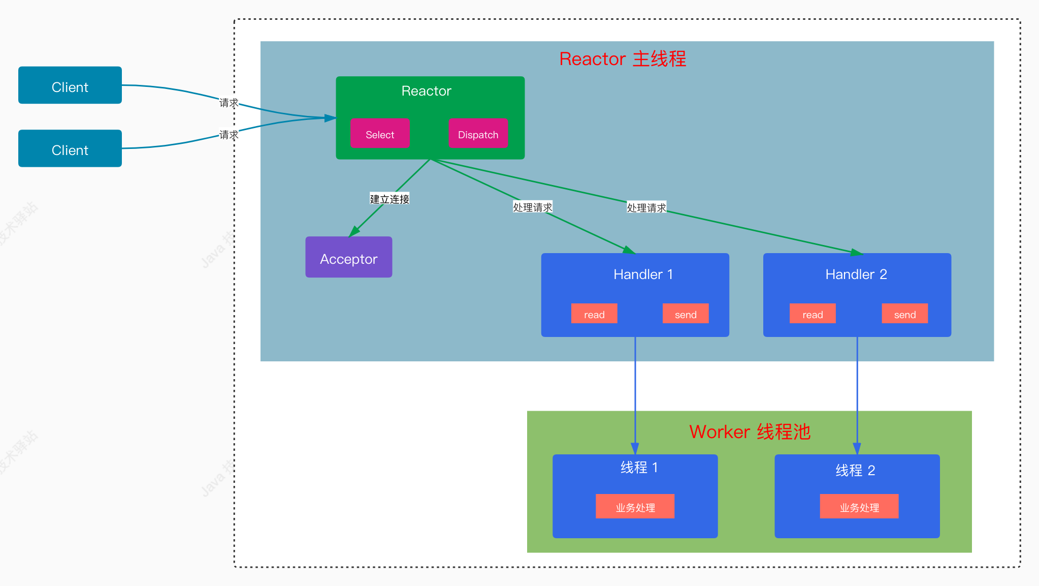 Reactor 线程通过 select (IO多路复用接口)监听事件,收到事件后通过Dispatch 来分发事件,事件会分发给Acceptor和Handler 两个组件,具体是哪个组件要看事件的类型。