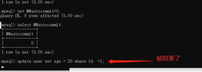 使用主键id为条件去查询,然后开启另一个事务去更新数据,更新被阻塞,加锁了,锁定要查询的id为1的行数据。